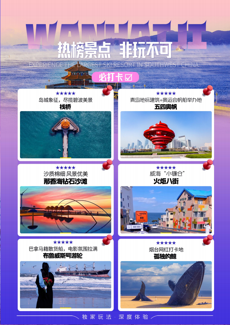 『今日焦点:二次元威海+烟台皇家养马岛+孤独的鲸+葫芦仙岛八仙渡+八仙广场=种草明星玩法』 早餐后开始今天的行程。 打卡大相框--【威海公园画中画】威海公园傍海倚山,风景秀丽。打卡【威海之窗大相框】,框起一片明媚的碧海蓝天,透过“大相框”看海天一色,风景图画,在这里,你也是组成风景的一部分。 威海小镰仓--【火炬八街】路的尽头是海,海的尽头是天,比海更浪漫的是火炬八街。这是威海自己独有的魅力。一条坡路,直通大海,白色咖啡厅,彩色的房子,蓝色的大海,妥妥的动漫色系。也是最出片的打卡圣地。 乘车赴烟台(车程约 1 小时) 抖音网红圣地--【皇家养马岛】养马岛历史悠久,相传秦始皇东巡此地,见岛上水草丰美,便传旨在此饲养战马,并封为【皇家养马岛】,养马岛因此得名。以其秀丽的山海和宜人的气候被称为【东方夏威夷】。 Sea&blue--【烟台金沙滩】这里坡缓水洁,沙质细柔,是我国优良的海水浴场之一。金沙滩顾名思义,其沙滩金黄细柔,色泽金黄亮丽,在国内实属罕有。沙滩林带郁郁葱葱,空气清新洁净,山、水、林、滩相映成趣;海滨路 |