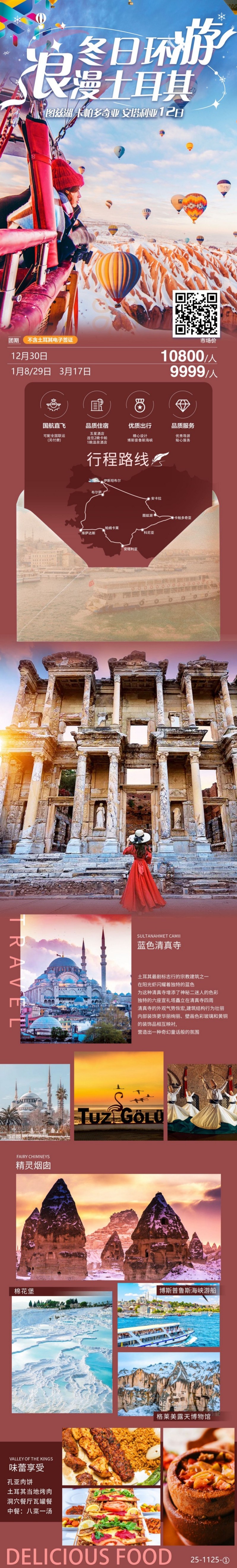 请拨打13506487734 张群(微信同号)添加微信获取优惠报价 【五大世界文化遗产震撼体验】漫游“棉花堡垒”棉花堡的钙化梯田,在千年温泉中泡浴;飞跃“外星地貌”卡帕多奇亚格莱梅露天博物馆,于清晨热气球上俯瞰精灵烟囱的壮丽日出;站立于以弗所古城的塞尔苏斯图书馆前,感受古罗马的繁华;步入伊斯坦布尔的历史街区,聆听拜占庭与奥斯曼帝国的千年回响。漫步“奥斯曼古镇”库马利克兹克的卵石巷弄,沉醉于木筋墙间的斑驳光影;闲坐百年老宅的庭院,品味土耳其乡村的淳朴与宁静。