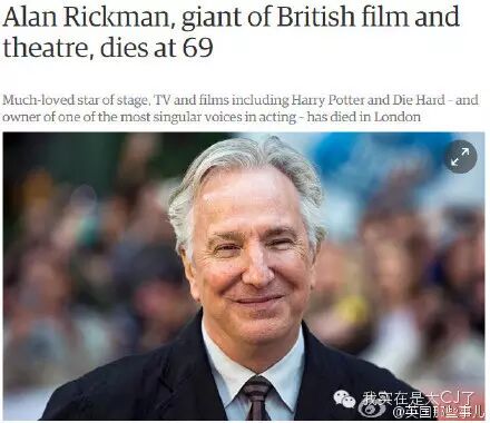 斯内普教授的扮演者Alan Rickman身患癌症去世,享年69岁。他的家人今日向媒体宣布了这一噩耗。Alan Rickman的病情此前并不为公众所知,他一直默默地与癌症和死神抗争。